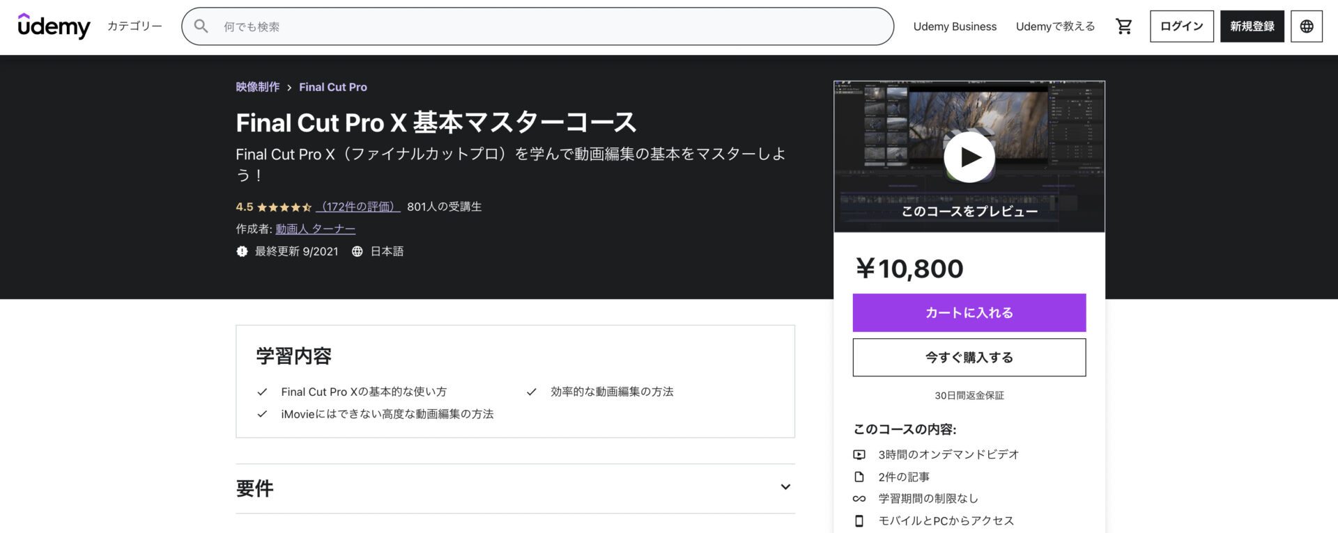 当然その中には、Final Cut Pro Xの講座もあり、講座を購入することで学習をすることができます。日本人による動画もあれば、海外の人のレクチャー動画もあるので、英語できる方などは海外の方の動画を購入してみるのも良いかもしれません。