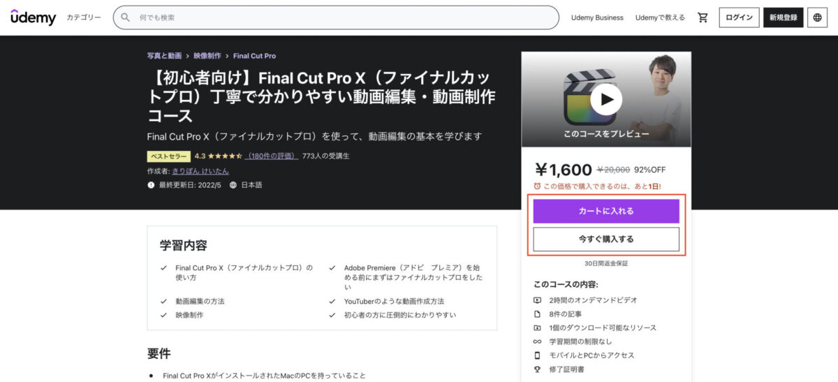 「Udemy」での講座の購入方法は、いたってシンプルです。